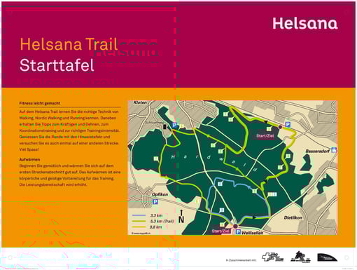 Der 5,3 km lange Trail und die 9,8 km Strecke gehen Richtung Kloten nach Opfikon, Wallisellen, Dietlikon und wieder zurück zu uns nach Bassersdorf.